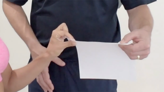 The patient typically sits or stands comfortably. Then, stand facing the patient and instruct them to perform a pinch grip by bringing the thumb and index finger together to pick up a small object, like a piece of paper or a pen. Observe their ability to execute the pinch grip and note any difficulties or abnormalities in the movement.